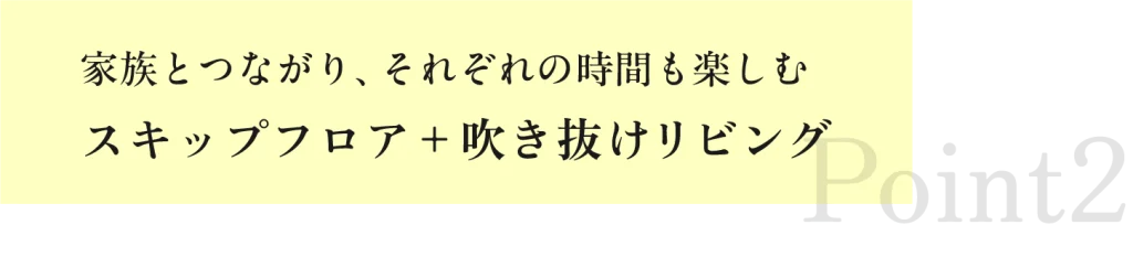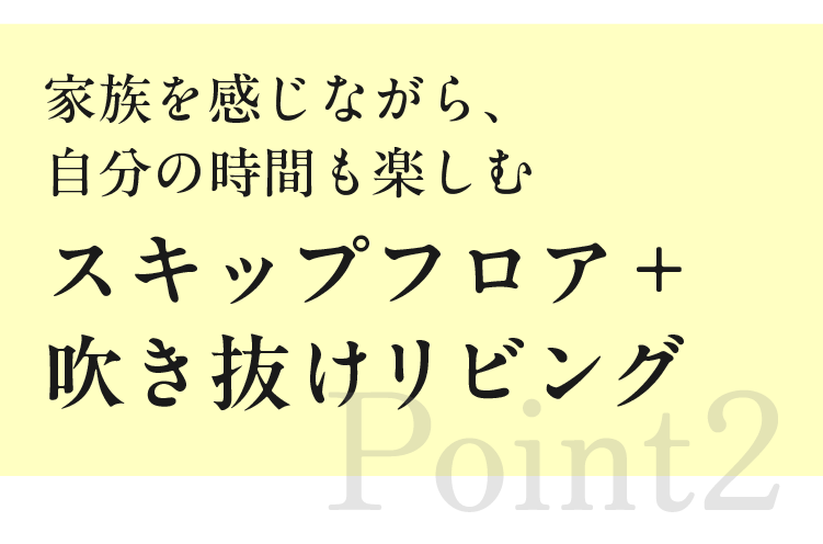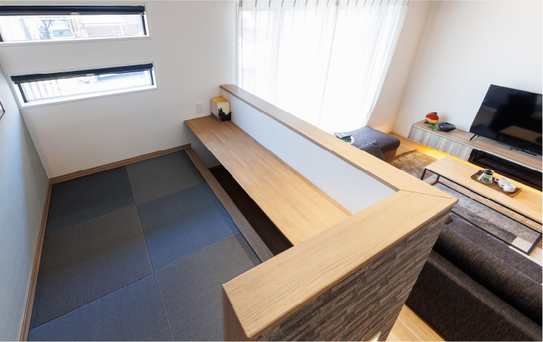 リビングと2階の中間に設けた「スキップフロア」。テレワークスペース、お子様のスタディコーナーや秘密基地のような遊び場にも大活躍。リビングから目が届くので、お互いに安心して自分の時間を過ごせます。