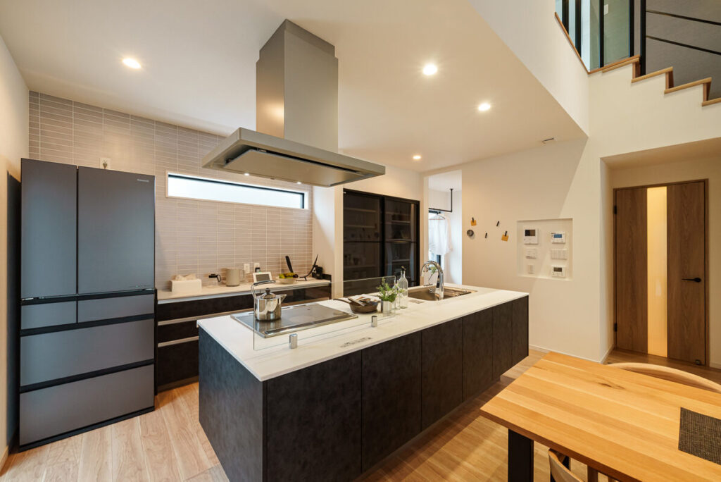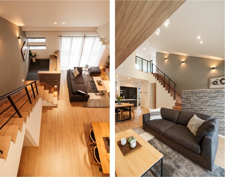2階の天井まで視線が抜ける「吹き抜けリビング」は、実際の坪数以上の圧倒的な開放感を演出。家じゅうどこにいても家族の気配を感じられる温かい空間です。