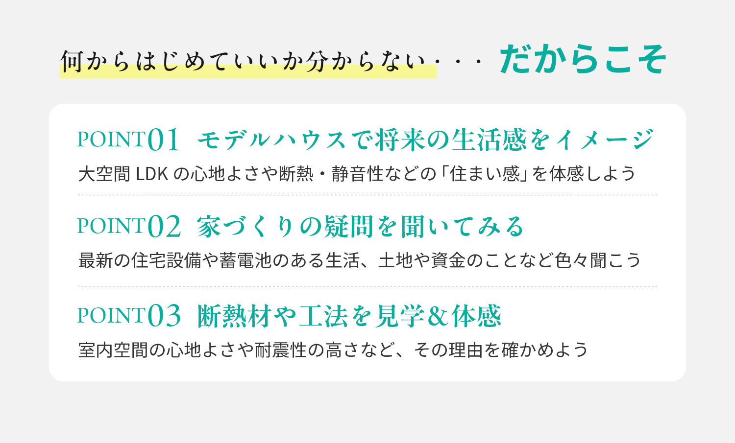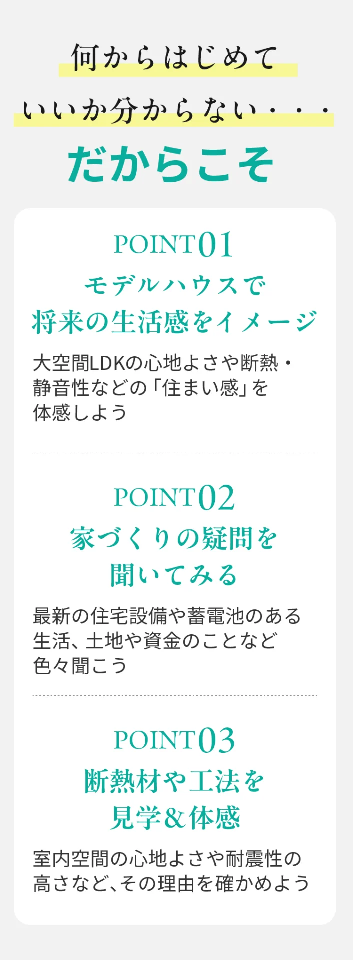 私たちの知識や経験が皆さまの住まいづくりのご参考になれば幸いです。「住宅ローンはいくらになる?」そんな心配もご相談ください。無理な売り込みは一切いたしません。お気軽にご来場ください。