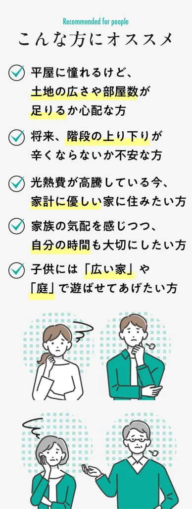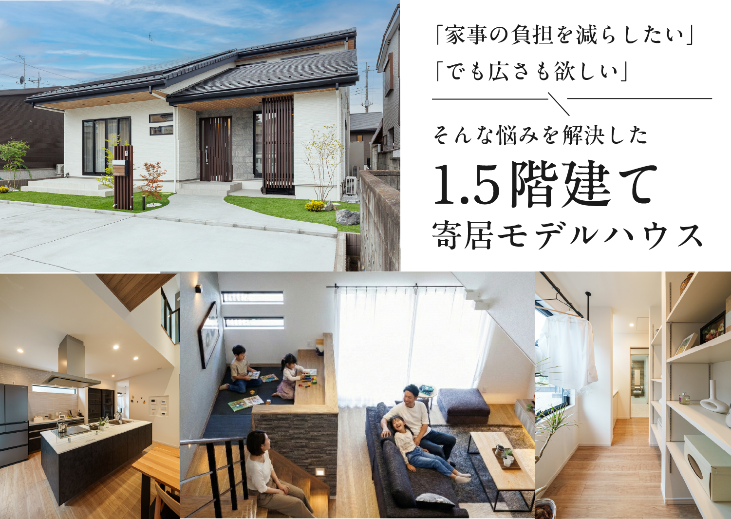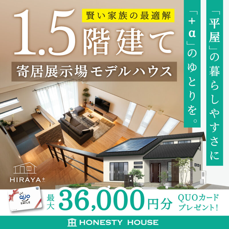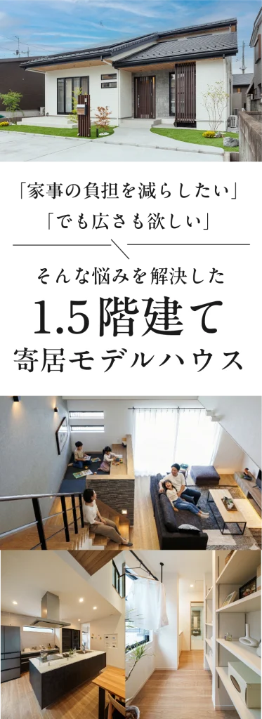 平屋のように1階で生活が完結する快適さに、+αのゆとりを持たせた「1.5階建て」モデルハウス。最短距離で終わる家事動線や、家族の気配を感じられるスキップフロアなど、毎日の暮らしをラクに、そして豊かにする工夫が満載です。賢く心地よい住まいのカタチを、ぜひご体感ください。