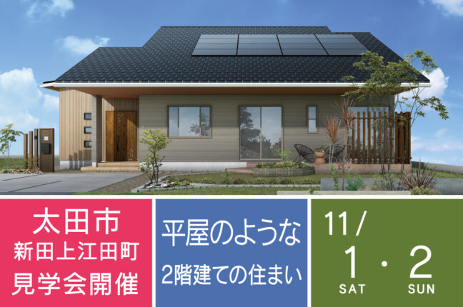 【開催日】 11月1日(土)・2日(日)【開催時間】 10:00~17:00【開催場所】太田市新田上江田町(太田市新田総合体育館近く) 見学会を予約する 今回見学できるのは、あらゆる世代にオススメ!1階で生活が完結する平 […]