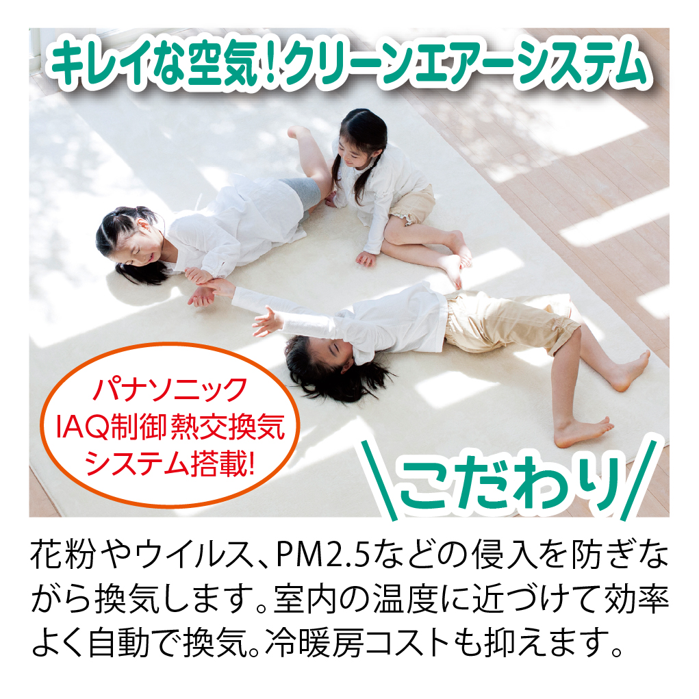 花粉やウイルスなどの侵入を防ぎながら室内の温度に近づけて換気するクリーンエアーシステムつき。冷暖房コストを抑えるので経済的です。