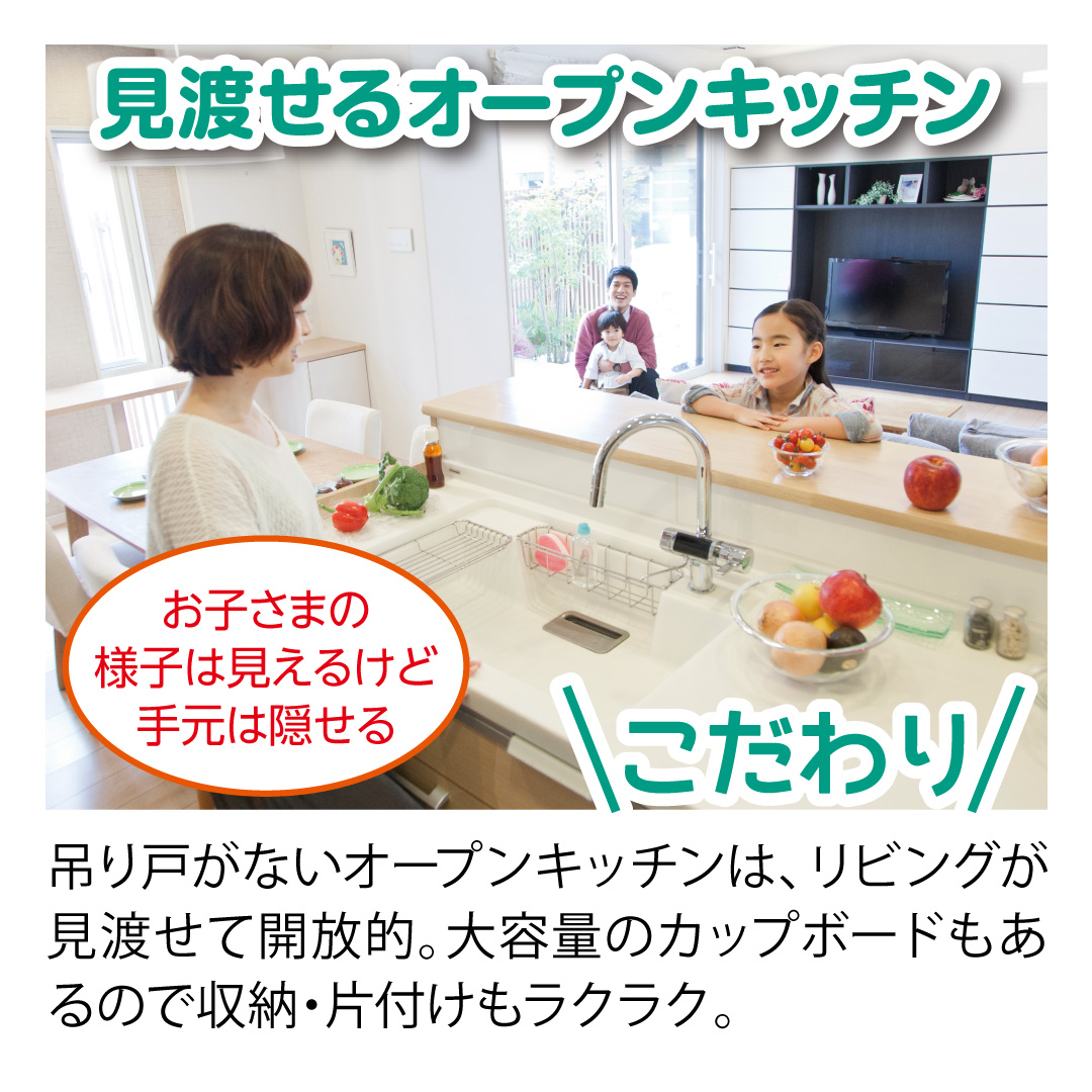 吊り戸のないオープンキッチンは、リビングから見渡せて開放的。大容量のカップボードもあるので収納・片付けもラクラク♪