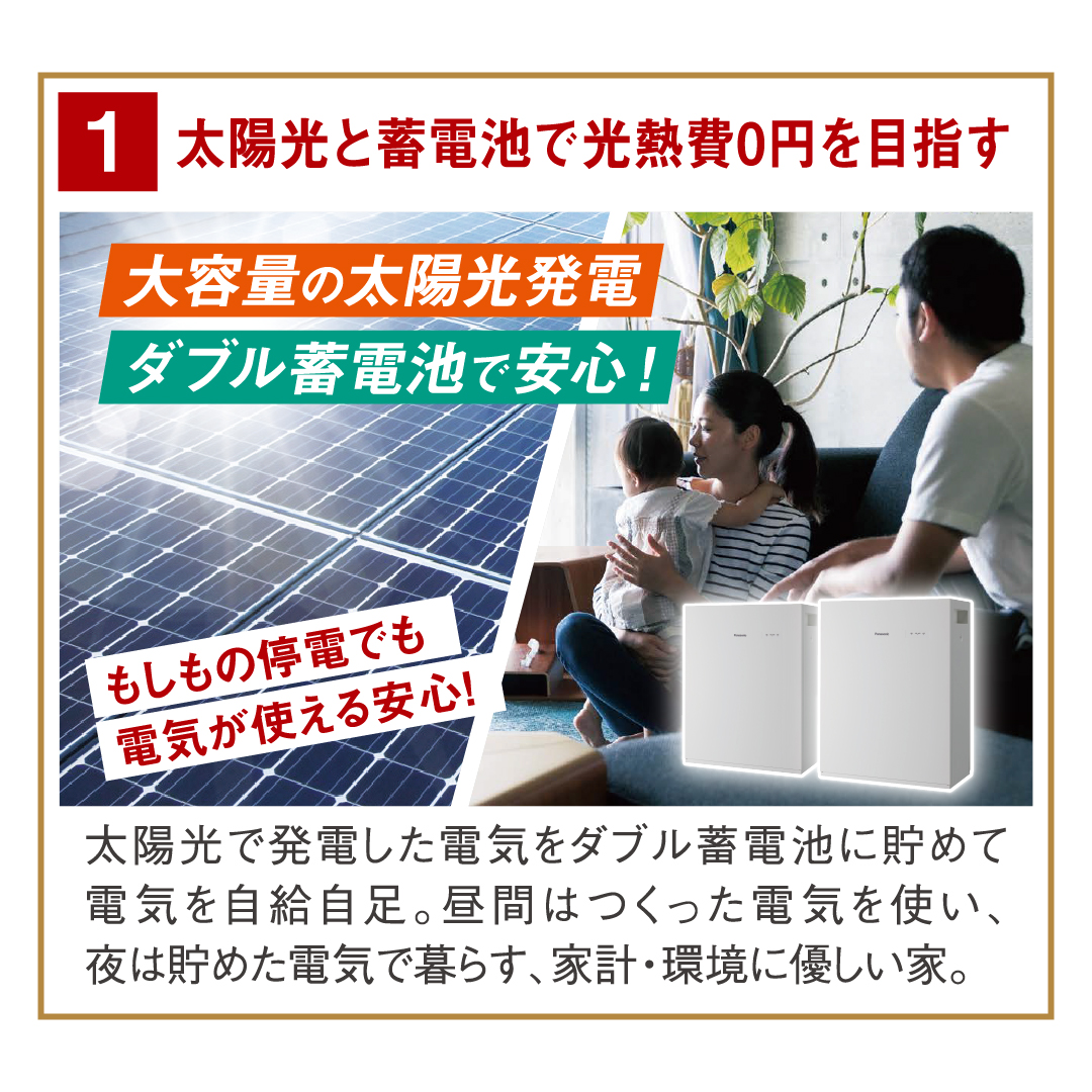 大容量の太陽光発電と蓄電池つきなので、電気を買わず、家計に環境にやさしいお家。