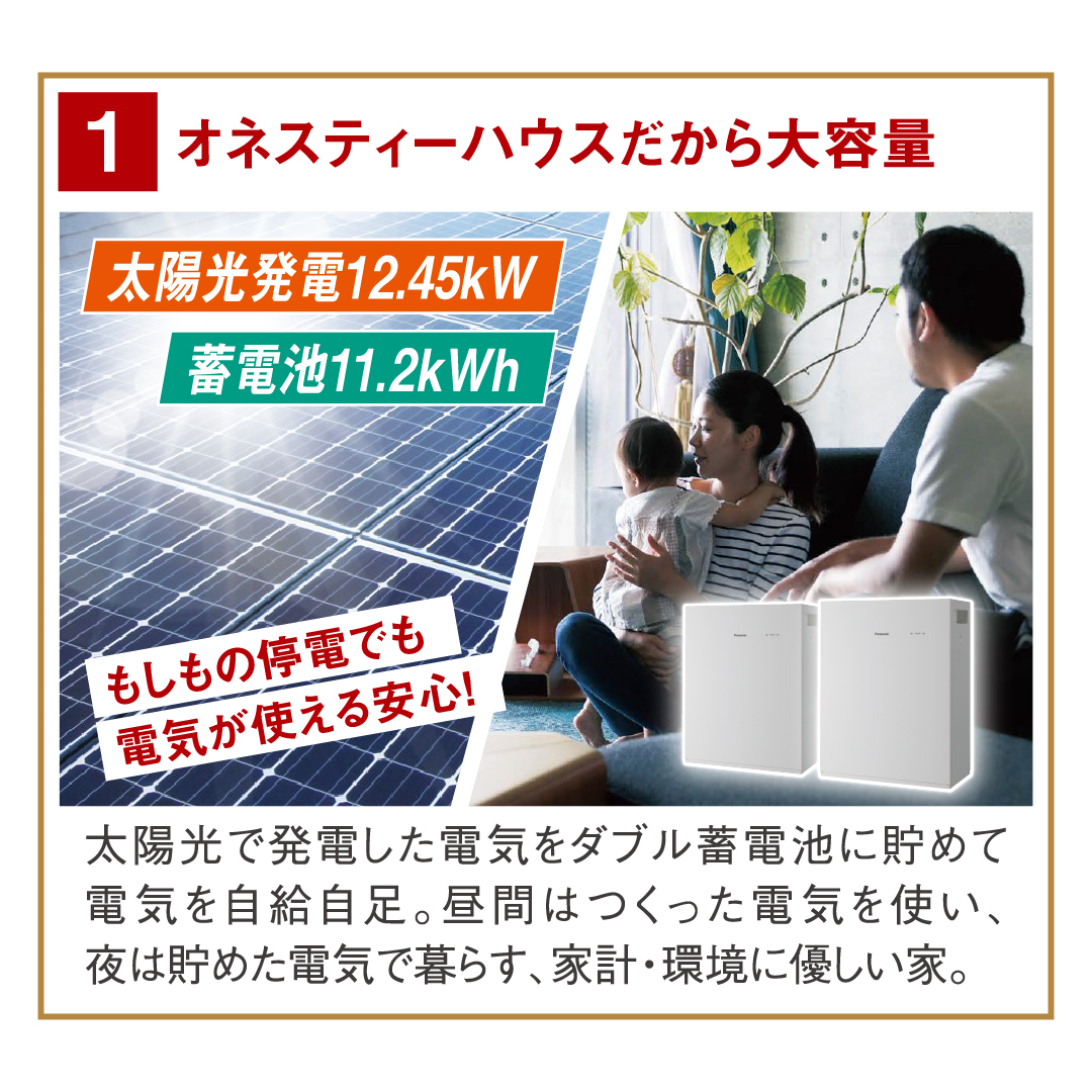 大容量の太陽光発電と蓄電池つきなので、電気を買わず、家計に環境にやさしいお家。