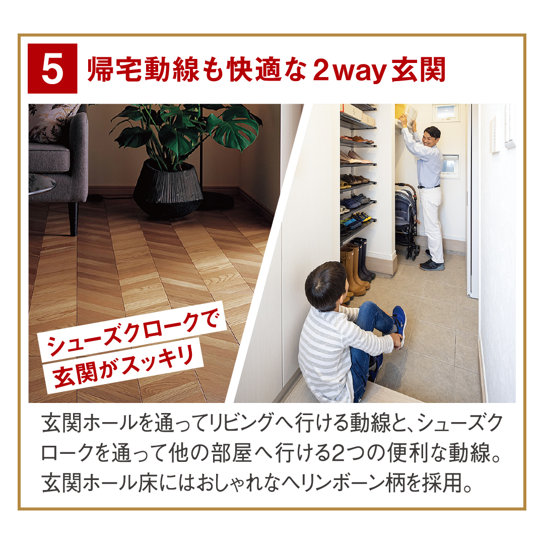 特徴的なL字型の間取りには、暮らしを便利にする生活動線や大空間LDKとタイルデッキで開放的な家族の憩いのスペースなどこだわりが詰まっています。