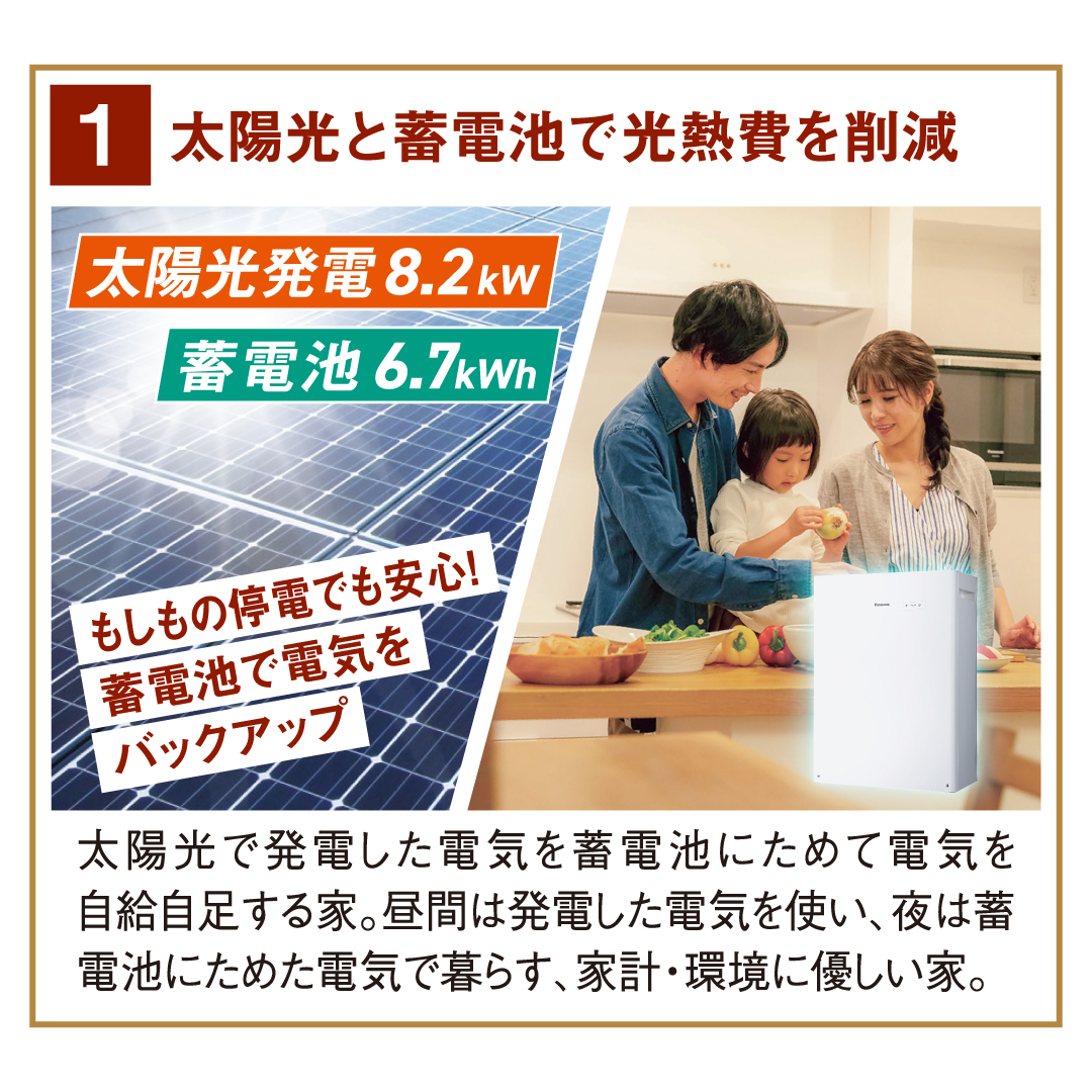 こちらのお住まいのスマートプリーマライトは、電気を「つくる」「ためる」「かしこく使う」ことで、自給自足できる住まいです。大好評の “光熱費 0 円を目指す家” スマートプリーマをライトにして、よりお求めやすくしました。