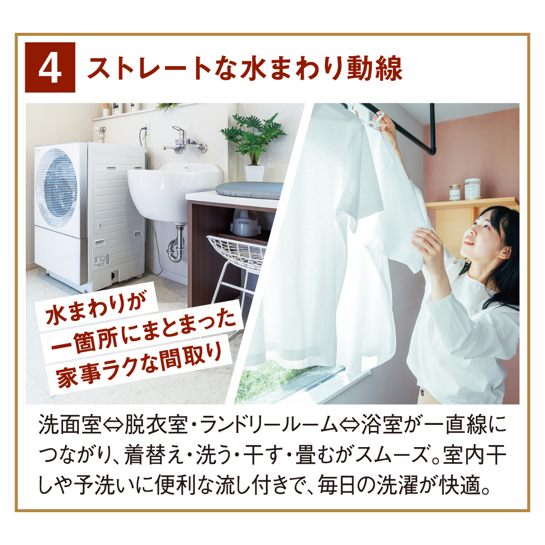 回遊性の高いキッチンやストレート動線の水まわりなど、暮らしラクな賢い間取りの住まい。スタイリッシュな外観とアクセントクロスを取り入れた洗練されたデザインが魅力です。
