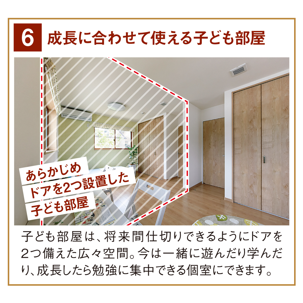 子ども部屋は将来間仕切れるようドアを2つ設置した広々空間。今は一緒に遊んだり学んだり、成長したら勉強に集中できる個室にできます。