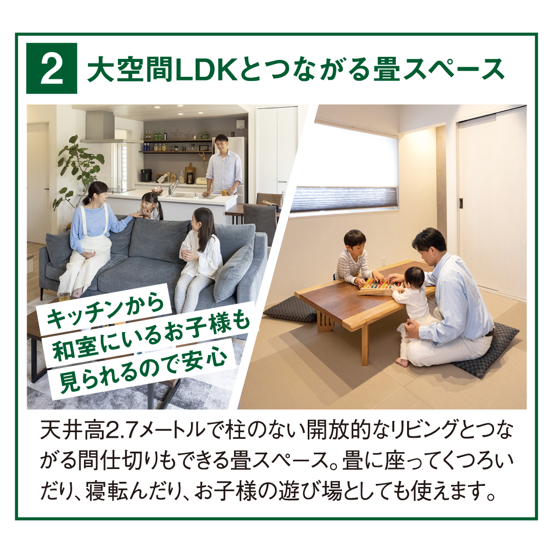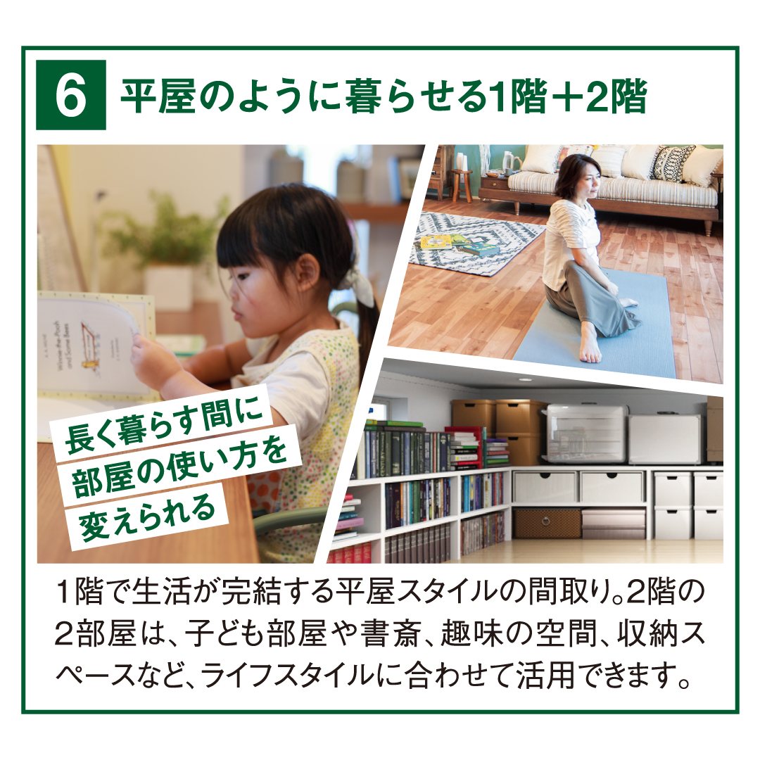 ワンフロアで生活しやすい動線の平屋に2階スペースと吹き抜けを併設した“平屋のように暮らせる2階建ての家”。2階の部屋は子供部屋・趣味部屋・収納スペースなど使い方はいろいろ。