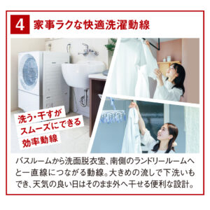 バスルームから洗面脱衣室、南側のランドリールームへと一直線につながる家事ラク動線。