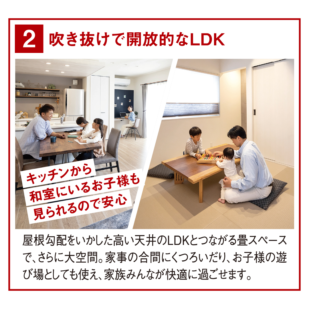 屋根勾配を生かした吹き抜けのあるLDKとつながる畳スペースで贅沢な開放感のある空間は、家族みんなの憩いの場になります。