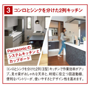 コンロとシンクを別けた2列キッチンは作業効率が高く、回遊動線とパントリーでさらに時短&便利!
