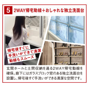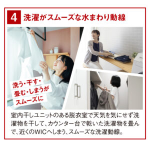 回遊性の高いキッチンや、土間収納も通れる2WAY帰宅動線洗う・干す・畳む・しまう がスムーズな洗濯動線など、