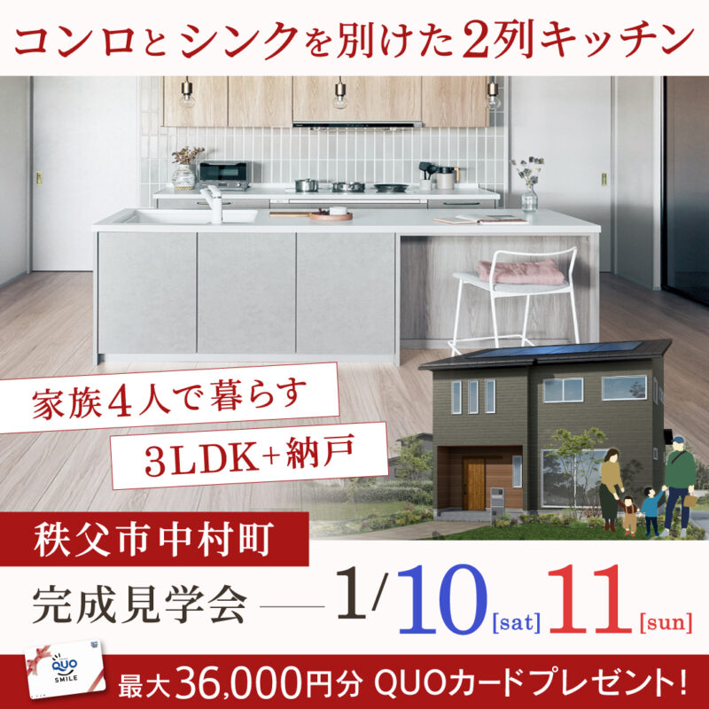 「コンロとシンクを別けた2列キッチンを採用!4人家族の住まい」秩父市の新築完成見学会