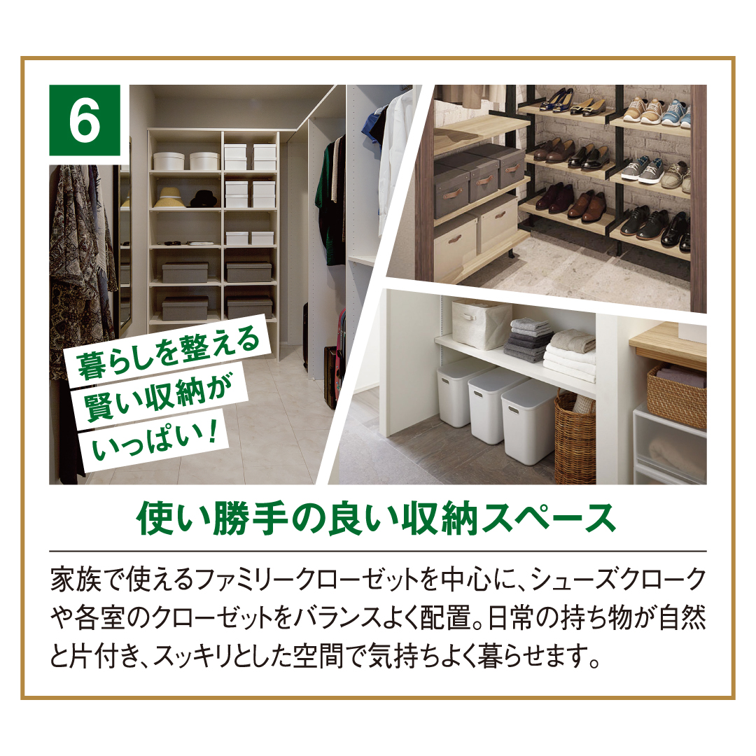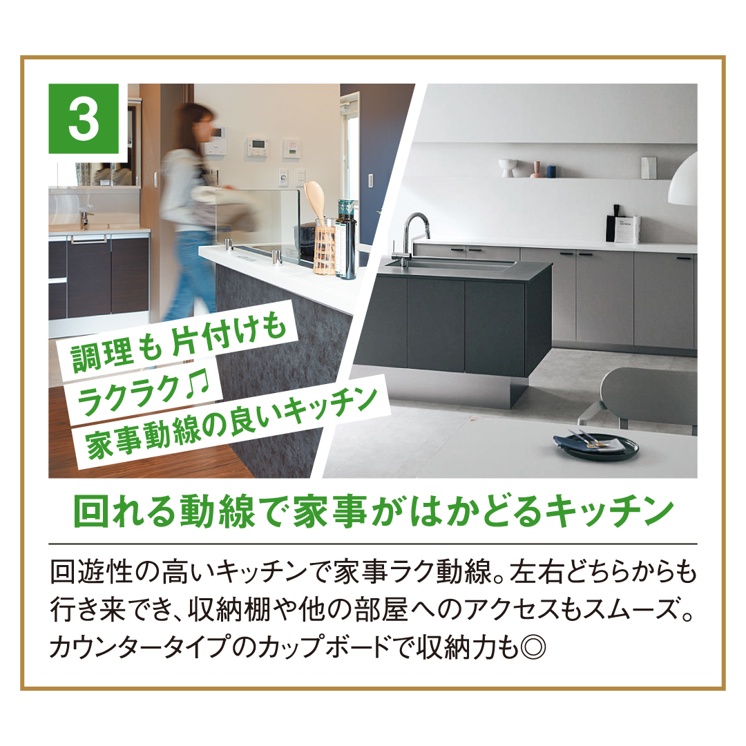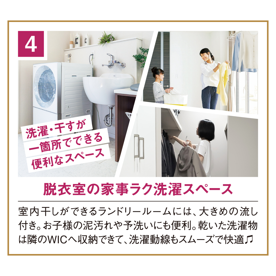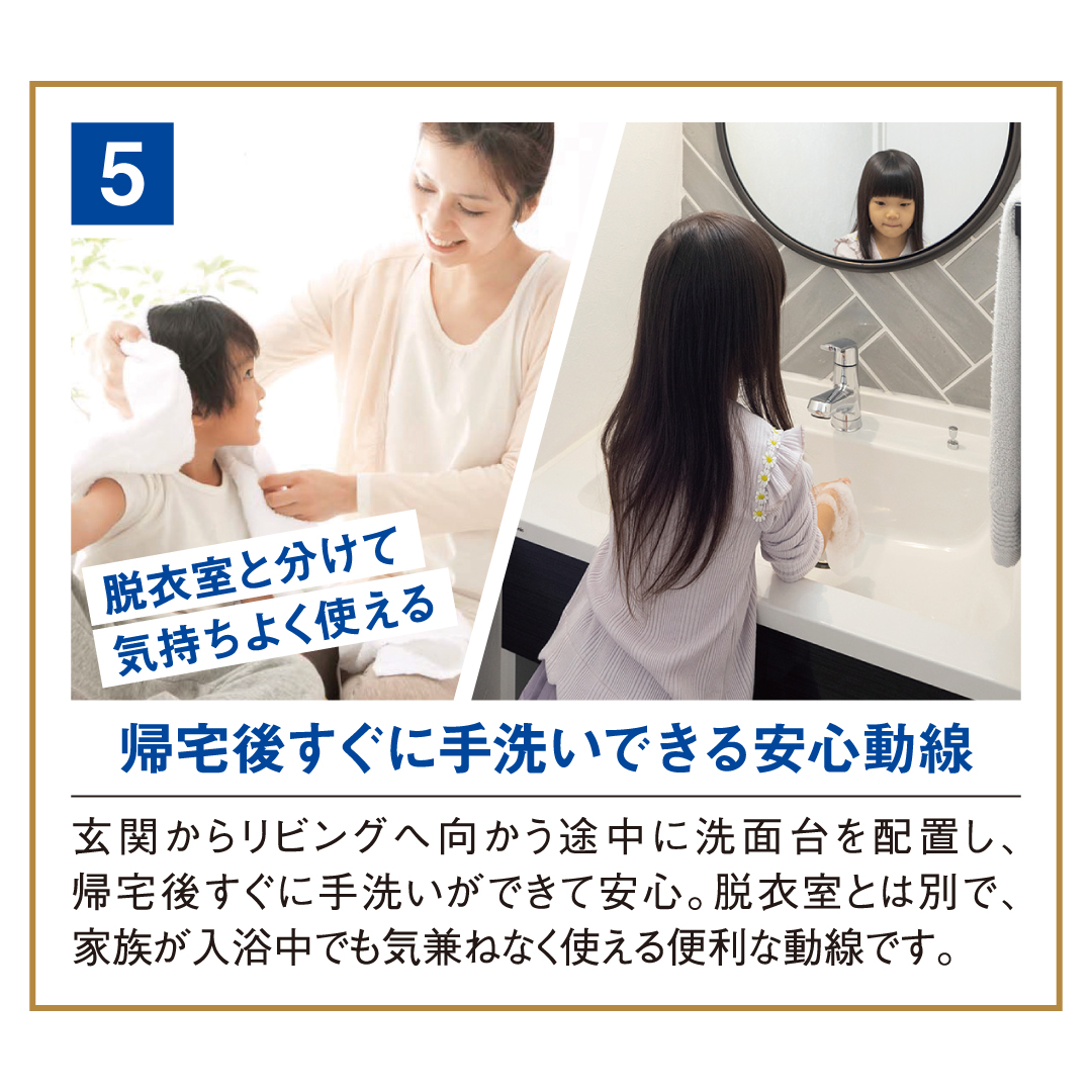 回遊性の高いキッチンや、玄関からリビングへの動線に配置した洗面台、ウォークインクローゼットと隣接したランドリールームなど、