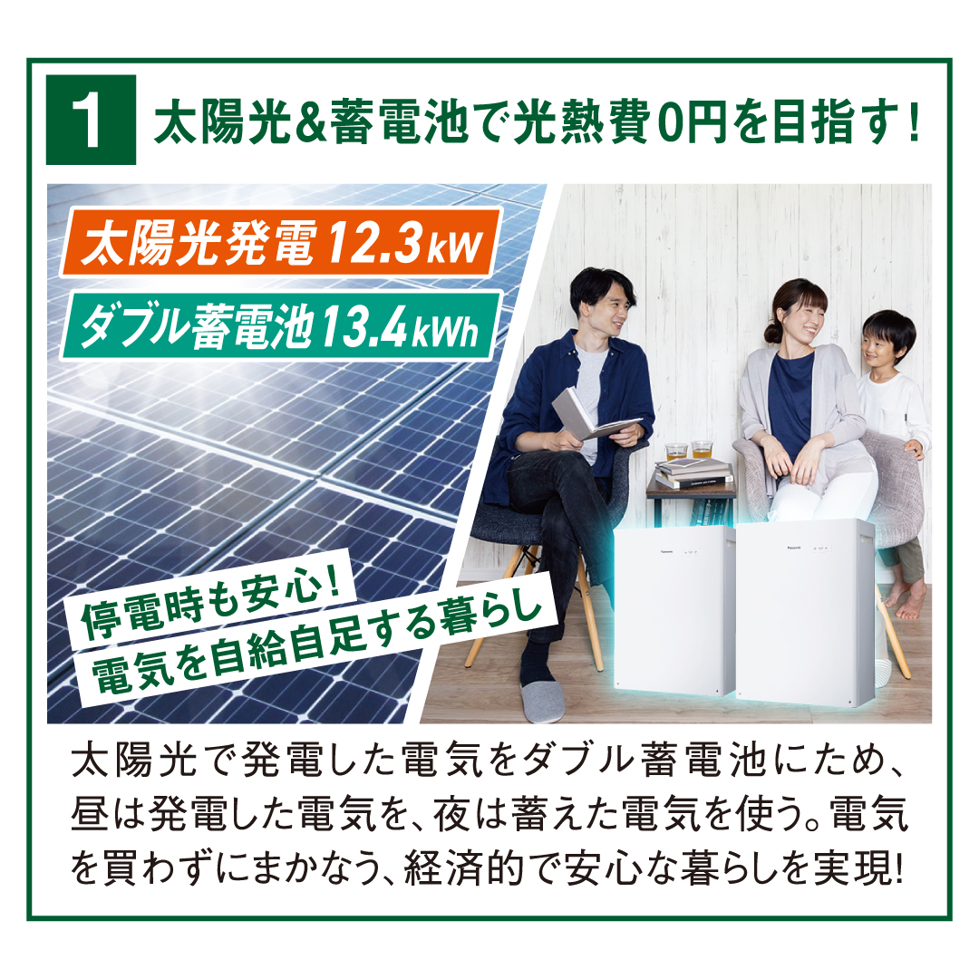 太陽光で発電した電気を大容量ダブル蓄電池にためて、昼も夜もためた電気を使えるから、住んでからの家計を助けます。