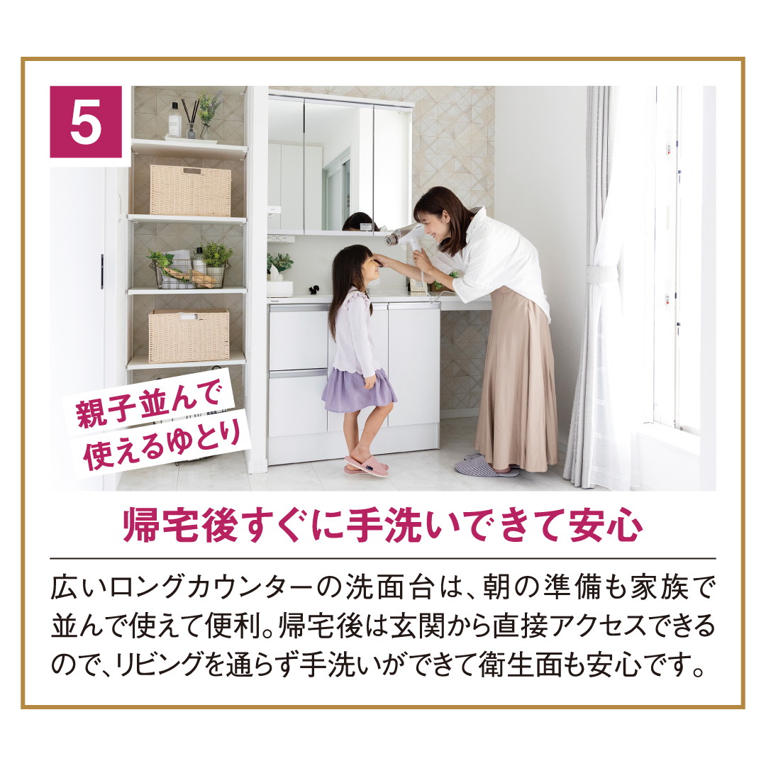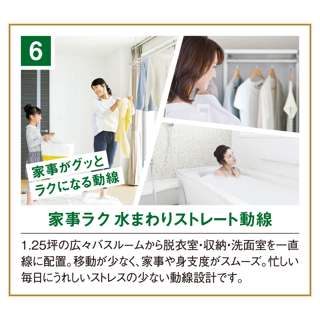 一直線に配置した水まわり動線、各部屋にたっぷり備えた収納スペースなど、