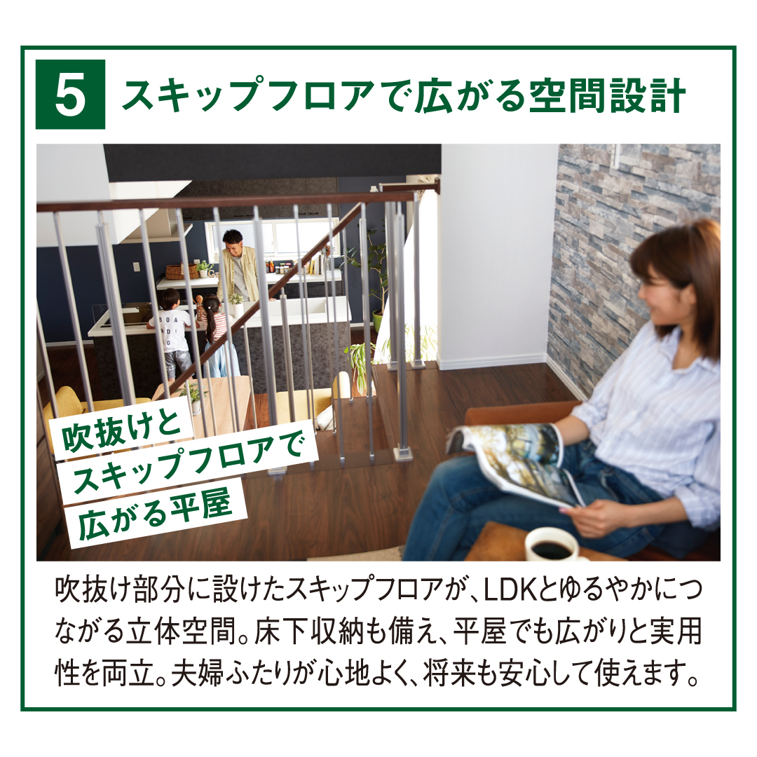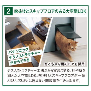 23坪のコンパクトな住まいに、吹き抜けとスキップフロアを取り入れた開放的なLDKや、猫ちゃん用ドア、クリーンエアーなど、人もペットも快適な工夫が満載。