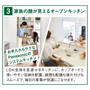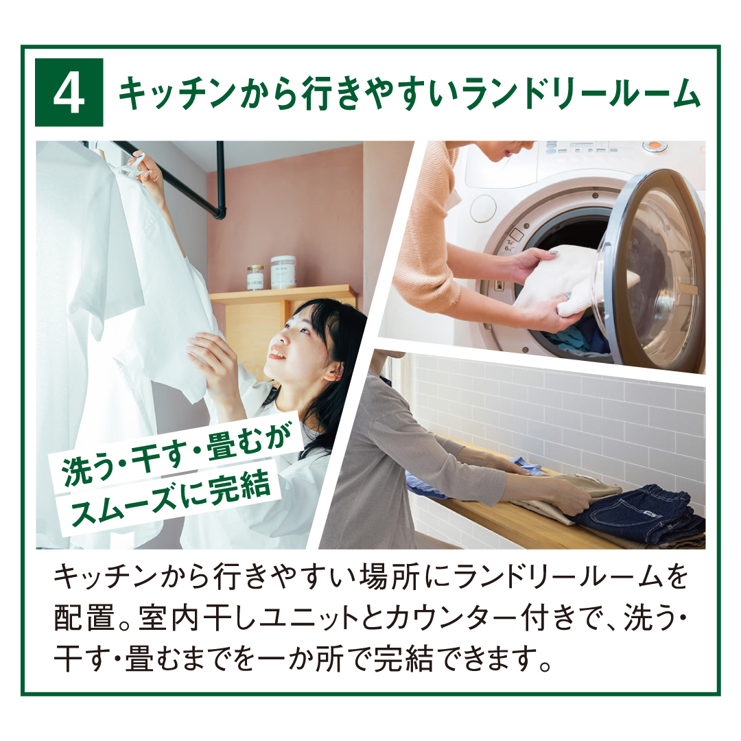 キッチンからの動線が良いランドリールームや、LDK全体を見渡せるキッチンなど、