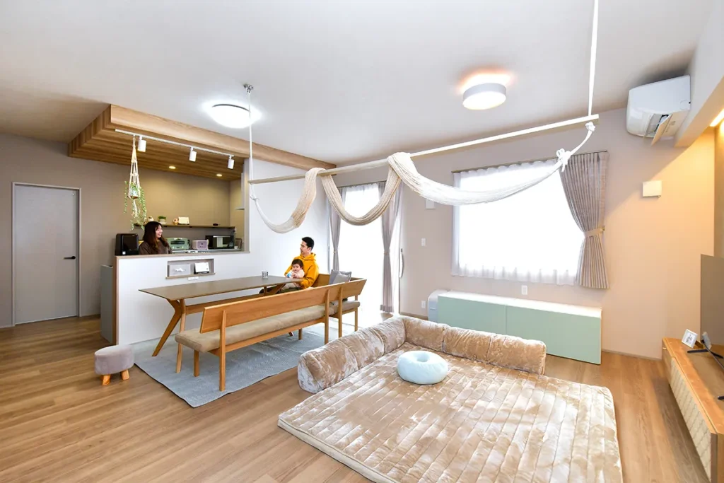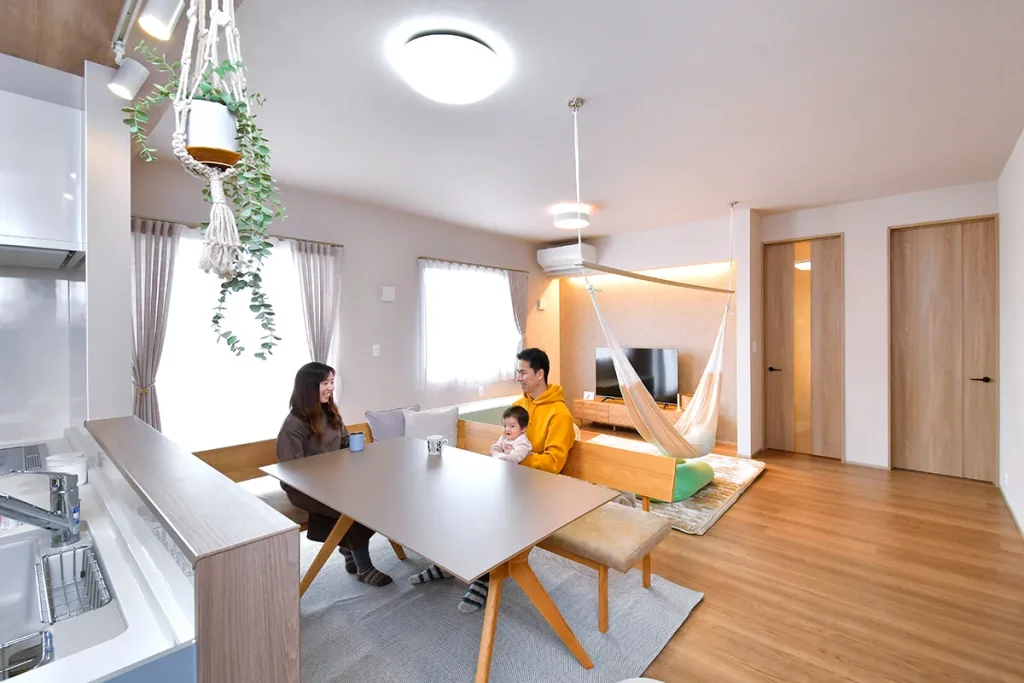 柱のない大空間にハンモックが揺れるLDK、玄関の照明や家事動線がお気に入り