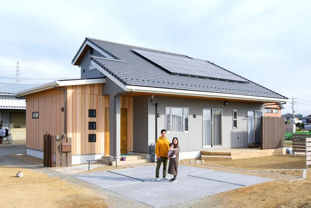 大屋根に太陽光パネルを6.56kW搭載し、グレーの基調色に木目調の外壁を組み合わせた温かみのある外観。