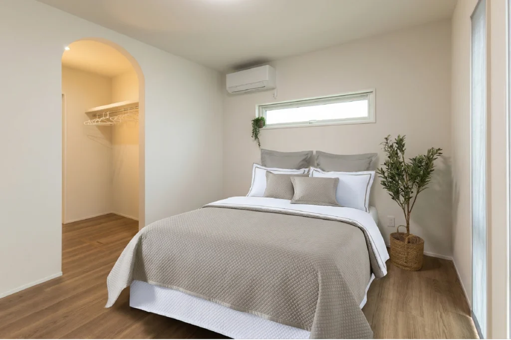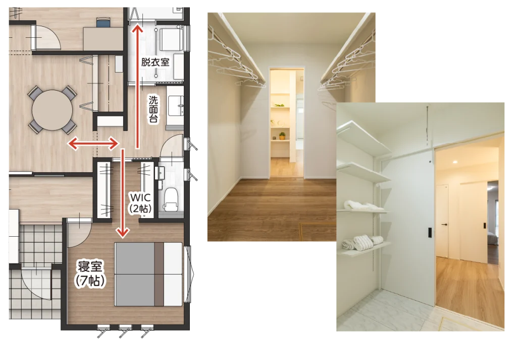 脱衣室からWIC、そして寝室へと繋がる設計。室内干し場としてだけでなく、朝の身支度や片付けもスムーズに完結