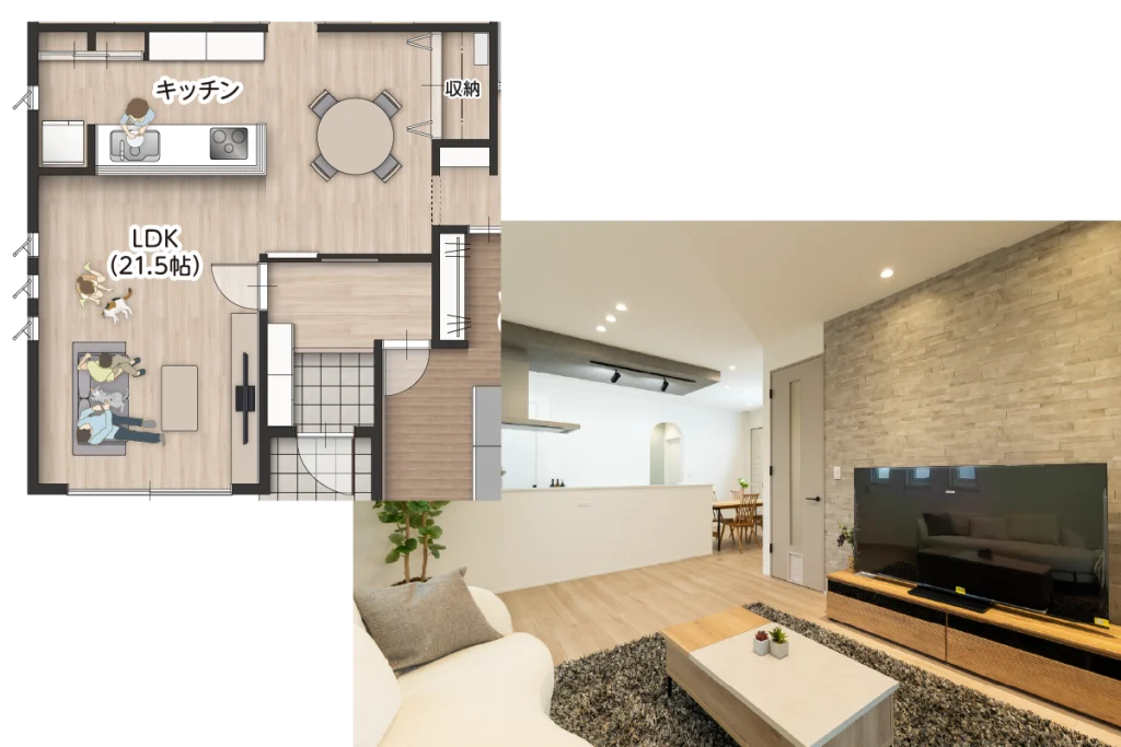 【LDK】21.5帖の大空間。高断熱で夏涼しく、冬暖かい