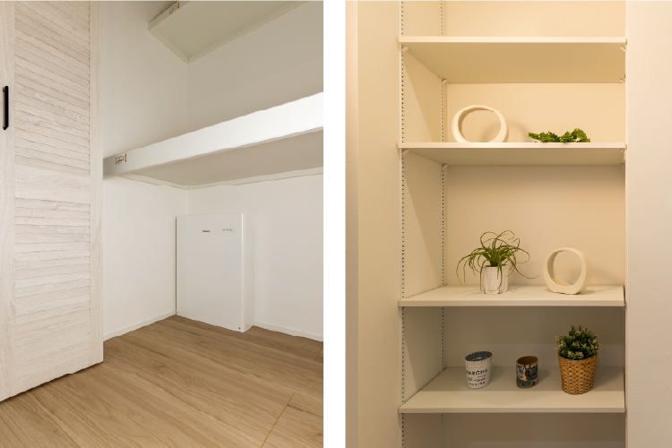 蓄電池をスマートに収納できる大容量収納と可動式の収納で家族の成長や持ち物の変化に合わせて柔軟に使える