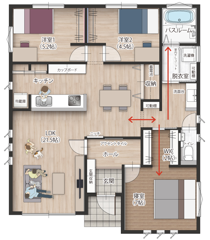 滑りに配慮した床やペット用くぐり戸、キッチン背面のパントリーや、脱衣室からWIC、寝室まで繋がる「家事ラク動線」が、毎日の家事を驚くほどスムーズに。ペットも家族も笑顔になれる住まいを実際に体感できるチャンス!