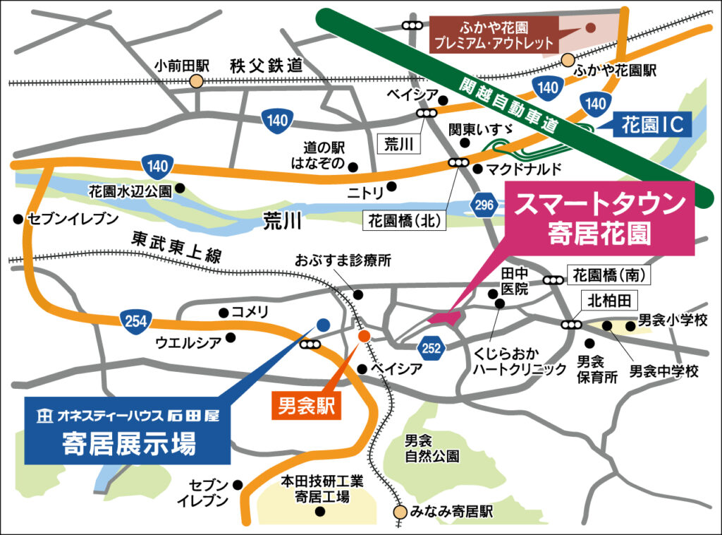 モデルハウスは、 スマートタウン寄居花園分譲地 内にあります。男衾駅・花園インター近くの全56区画の自然豊かな分譲地です。
