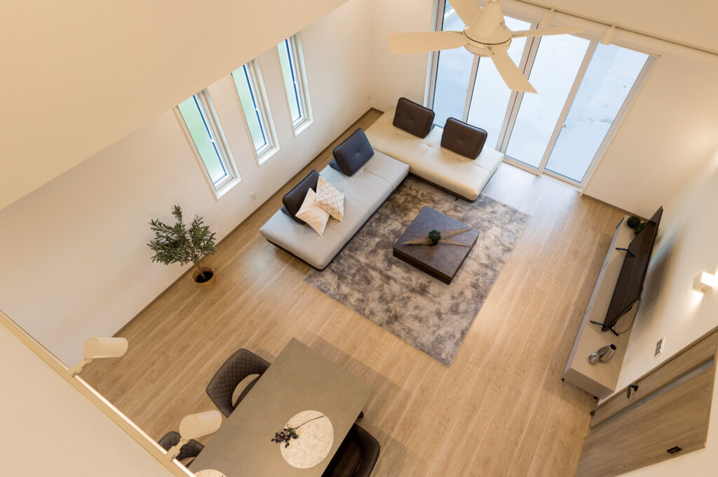 屋根の勾配を活かした最大約5メートルの高天井が、自然光をたっぷりと差し込み、家族との時間を明るく開放感に過ごせる