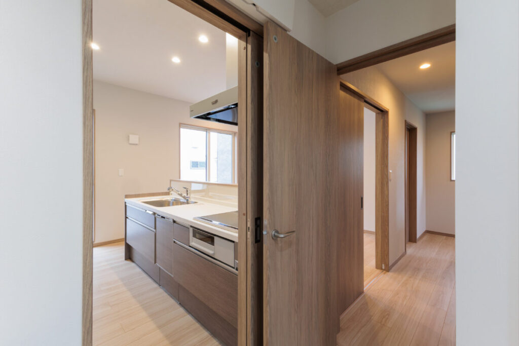 キッチンから脱衣室・バスルームへとつながり、ダイニングを通って戻れる回遊動線。家事がスムーズ