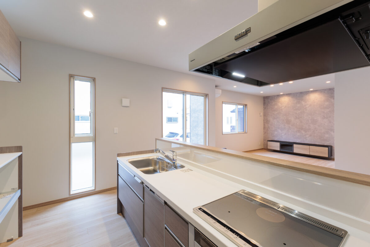 パナソニック製のキッチンが標準。リビング全体が見渡せ、家族との会話も弾む心地よい空間
