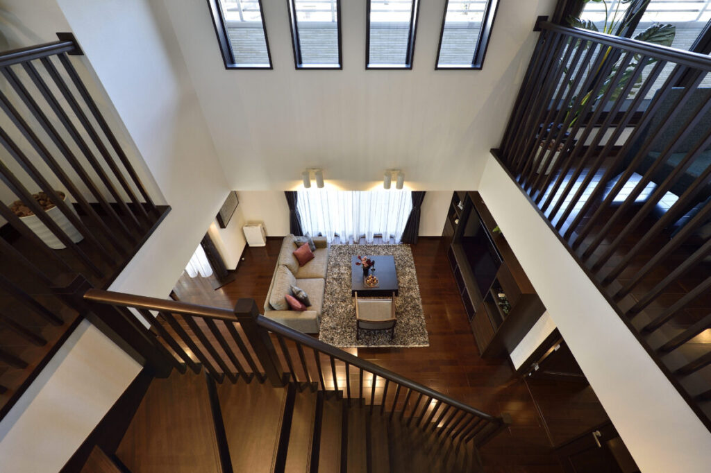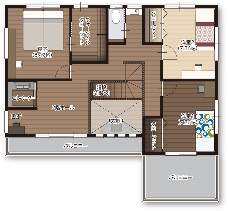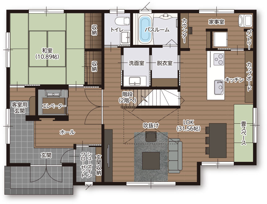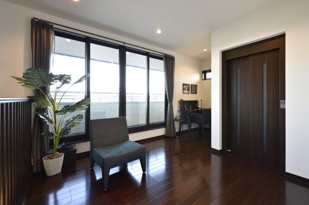書斎スペースもあるホールにホームエレベーター。掃除機や布団などの移動もスイスイ