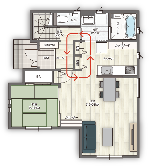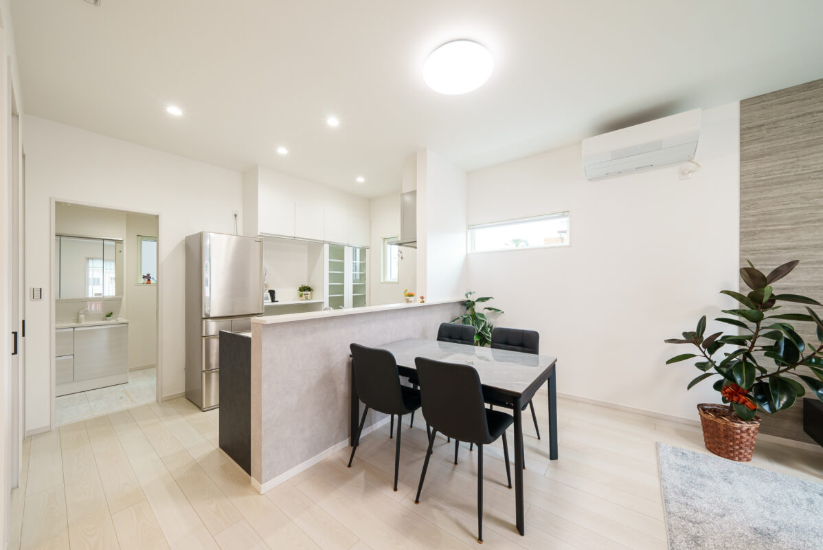 洗濯室・トイレ・玄関・リビングをスムーズに回遊できるキッチン