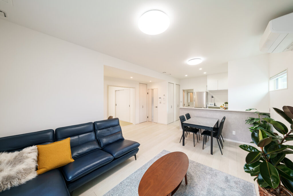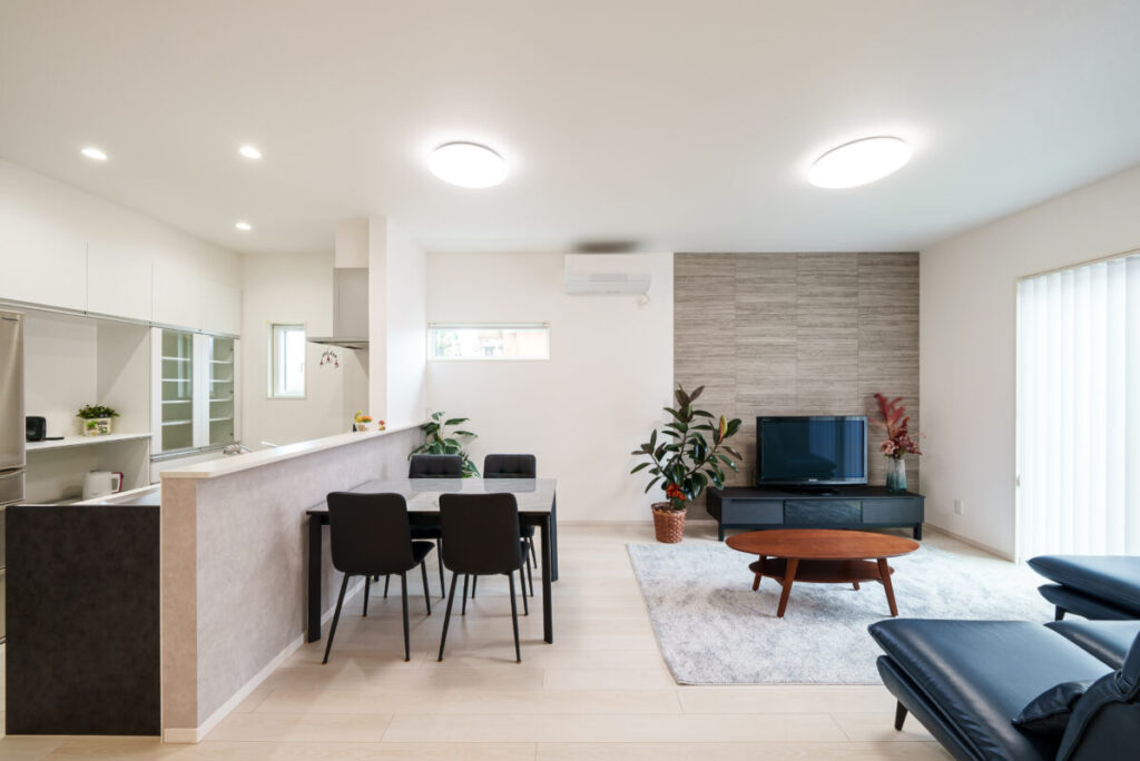コミュニケーションがとりやすいダイニング。テレビ背面のアクセントタイルは調湿・消臭効果も