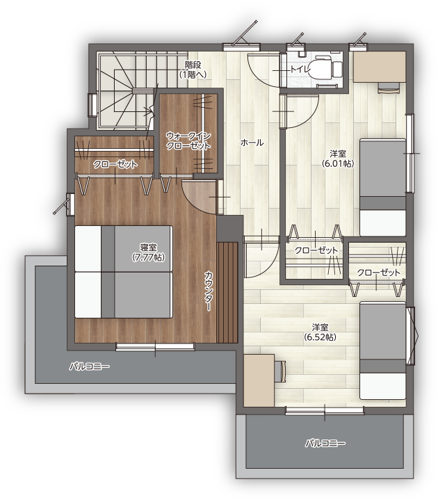 広い多目的カウンターを備えた主寝室は、L字型バルコニーに隣接した明るく快適な空間。大きなウォークインクローゼットも