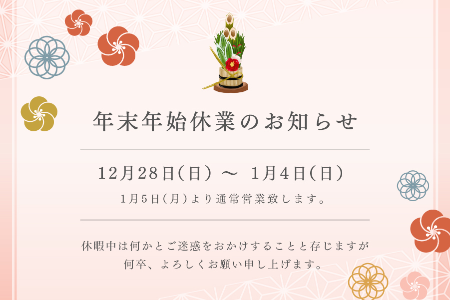 誠に勝手ながら、年末年始の期間につきまして、以下の通り休業とさせていただきます。