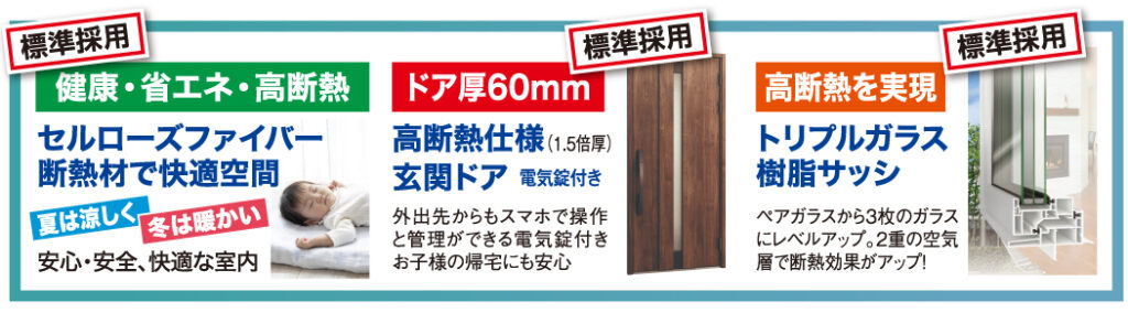 優れた断熱材(セルローズファイバー等)を使用し、一年中快適で健康的に過ごせる住環境を提供します。