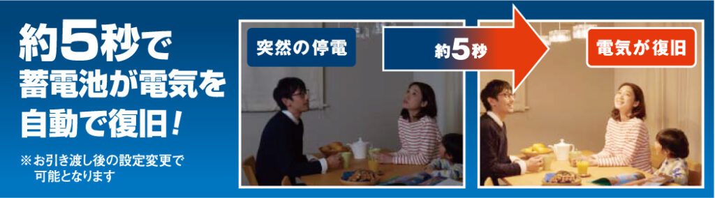 停電でも蓄電池システムが約5秒で電気を自動に復旧。災害などの停電時でも普段の生活ができ、安心です。