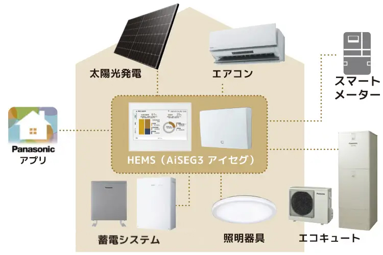 HEMS(AiSEG3)で、自宅で使う電気を「見える化」し、エアコンや照明などの設備をコントロールすれば、無駄なく快適に電気を使うことができます。さらに、台風などを予想して、自家消費を抑えるので、万が一の災害時も蓄電池の電気が使えて安心です。