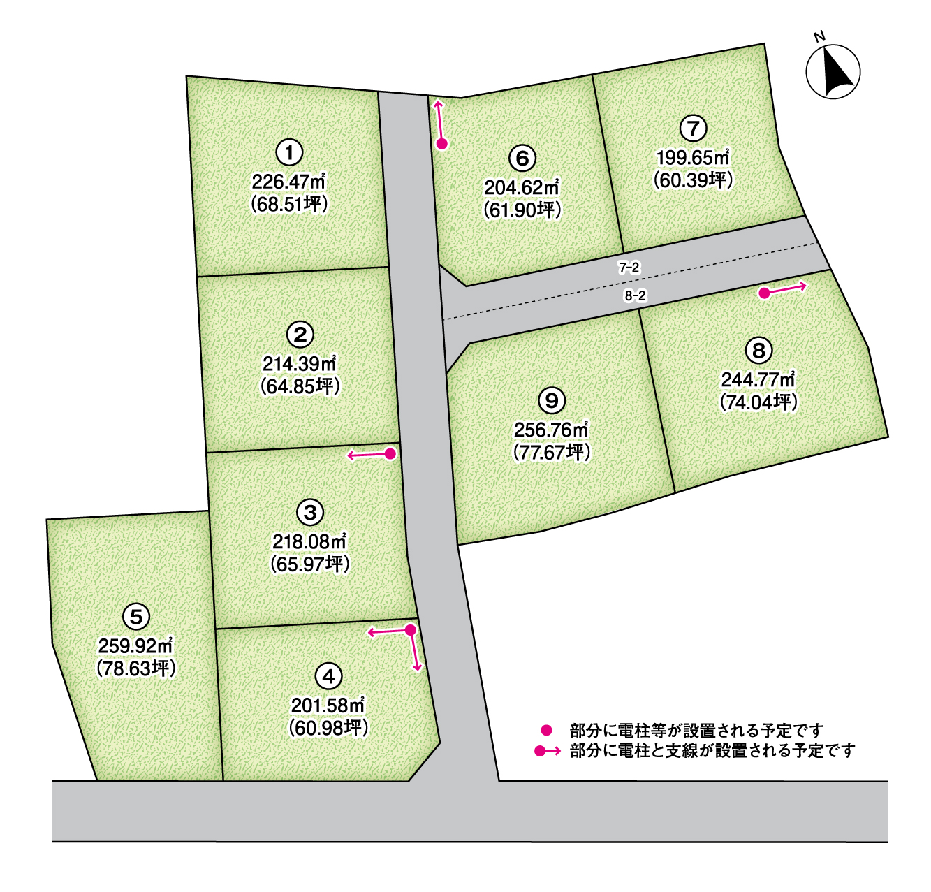 ※7-2は⑦の所有権、8-2は⑧の所有権となりますが、⑥・⑦・⑧地の通行地役権があります。費用は売主負担 ※分譲地内中央の道路は、①〜④・⑥〜⑨・1520-3番地住民の方の計9件での持分となります。