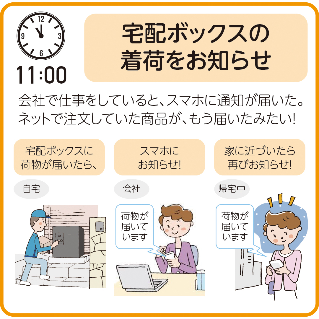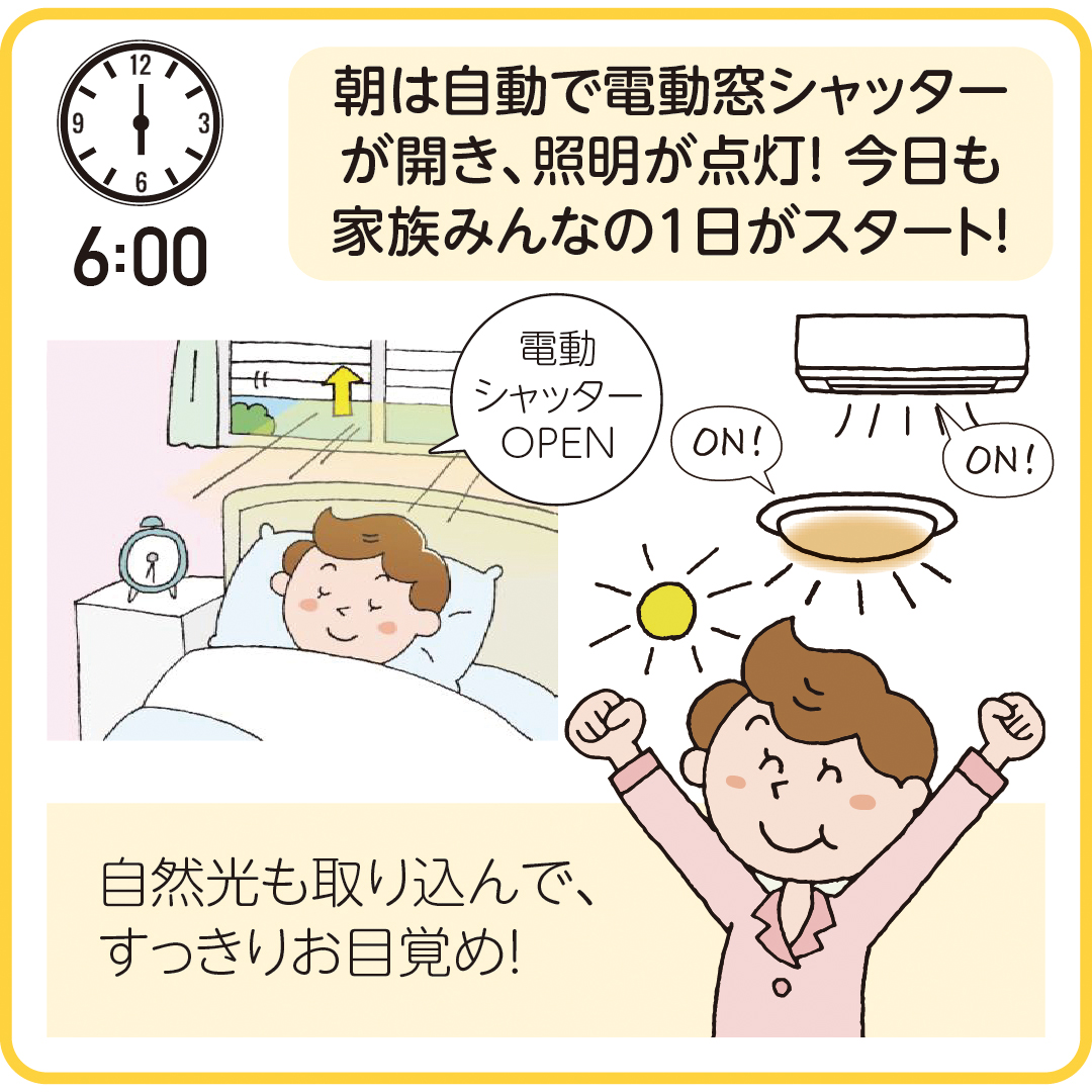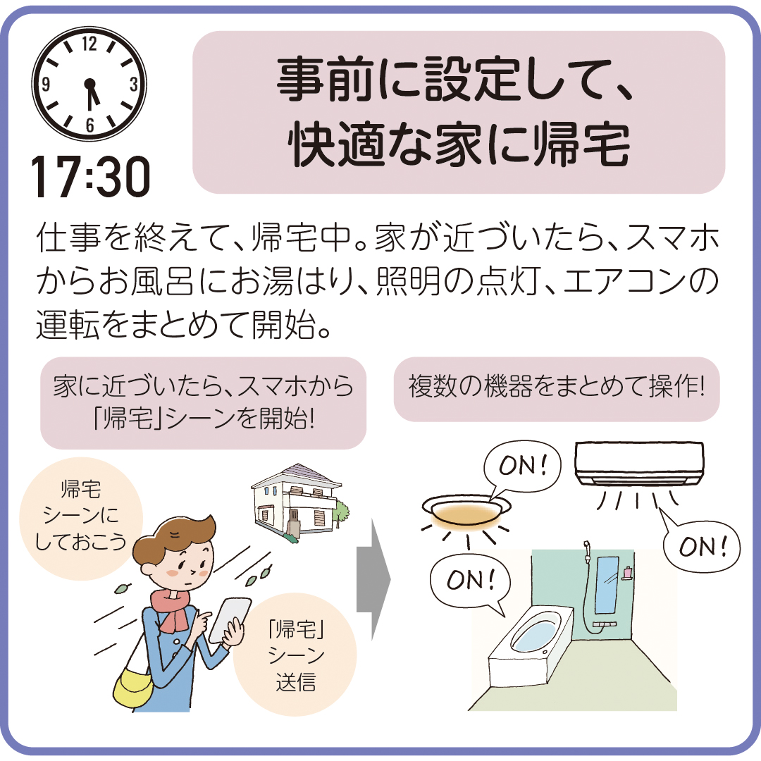 スマートネクストでの便利な暮らし。例えば、あなたが家に帰る時間に合わせて、部屋の温度を調節したり、照明をつけたりしておくことができます。
