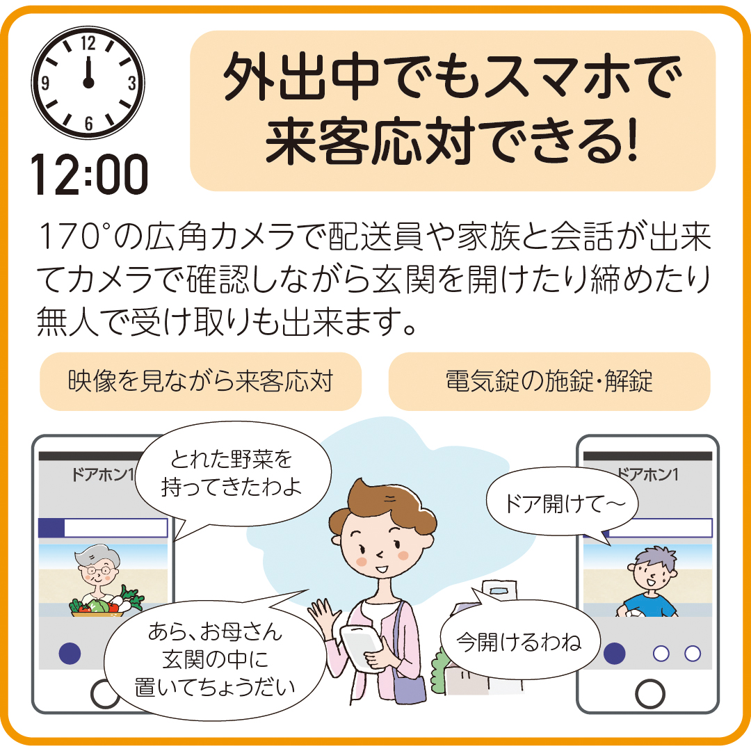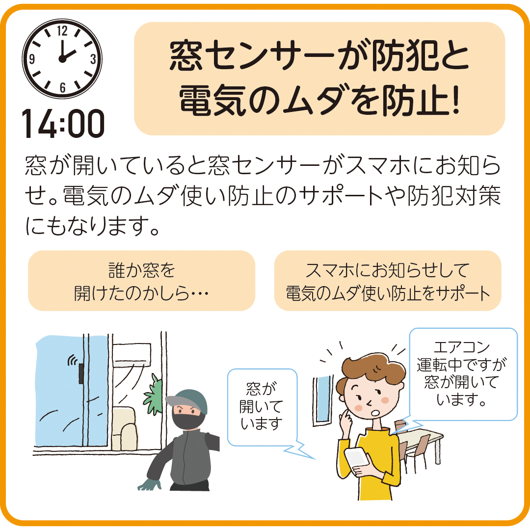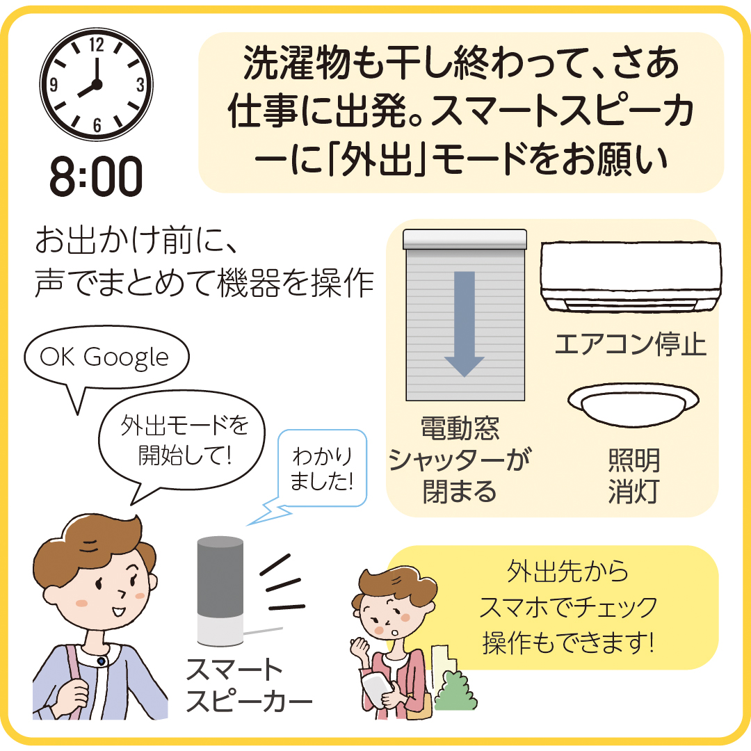スマートネクストでの便利な暮らし。例えば、あなたが家に帰る時間に合わせて、部屋の温度を調節したり、照明をつけたりしておくことができます。