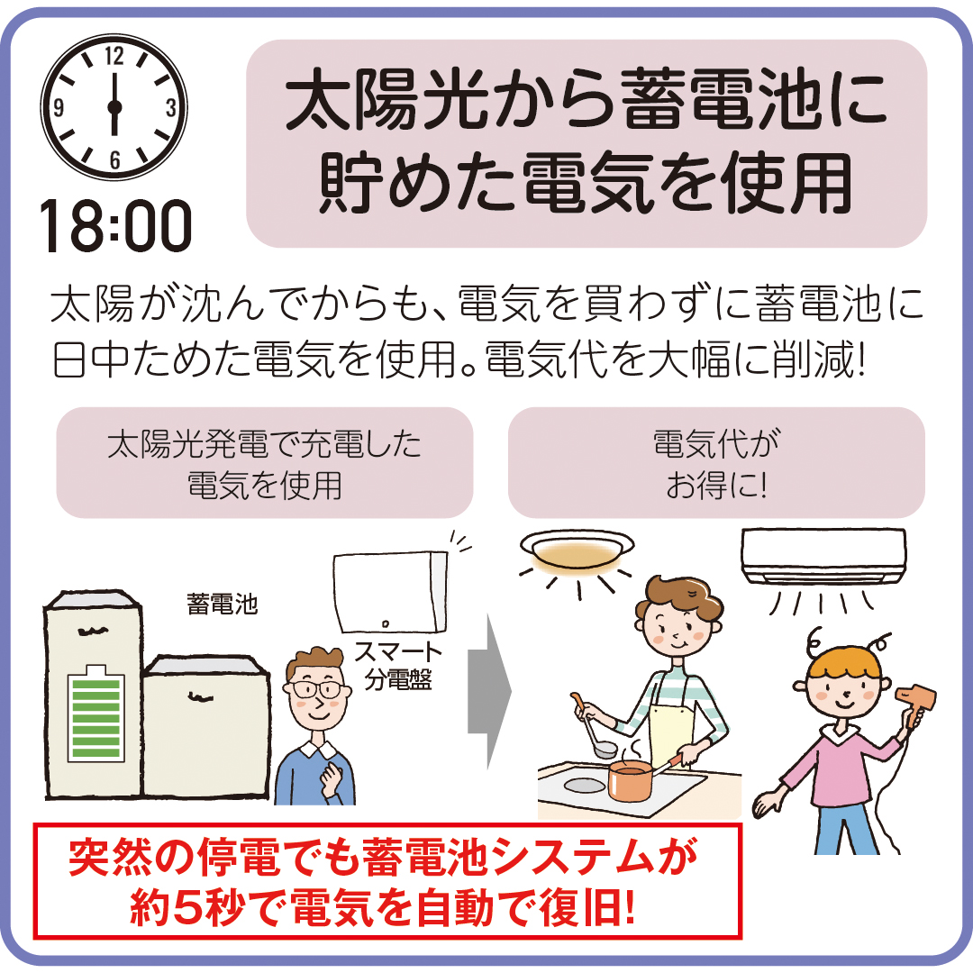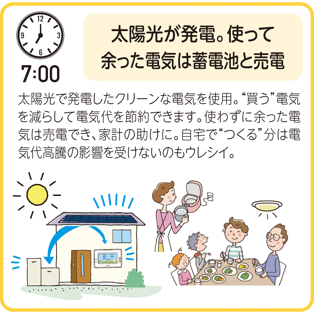 太陽光で作った電気を蓄電して自分の家で使えるので、災害などによる停電時にも電気が使える暮らし
