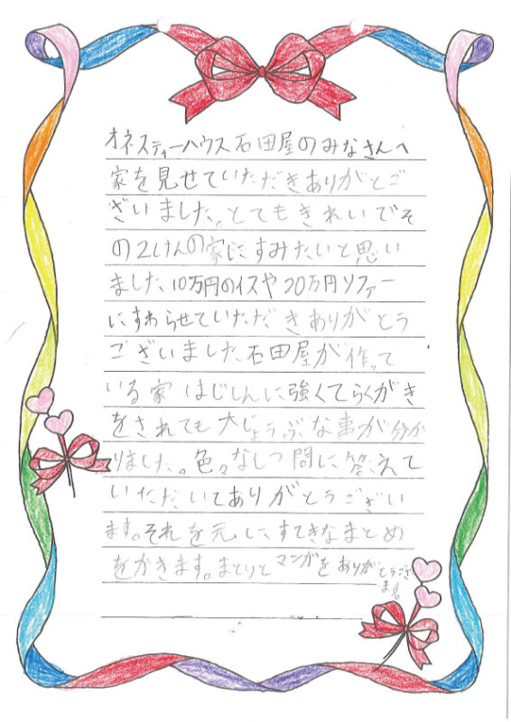 「お家づくりの秘密が知れてよかった」「将来こんなお家に住みたい」など、素直で心温まる感想がぎっしり詰まっており、スタッフみんなで笑顔で読ませていただきました。日々の業務の何よりの励みになります。